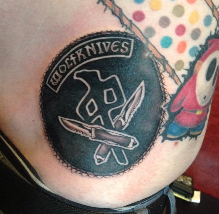 One is a Wolfknives patch, a solid black piece with intricate details, which still hasn’t bled out to this day. The second was a bird skeleton that Lacey added some color to, still just as vibrant as the day she did it three years ago. And the last was a poop emoji with nerd glasses, which Jon calls “Intelligent Turd.”