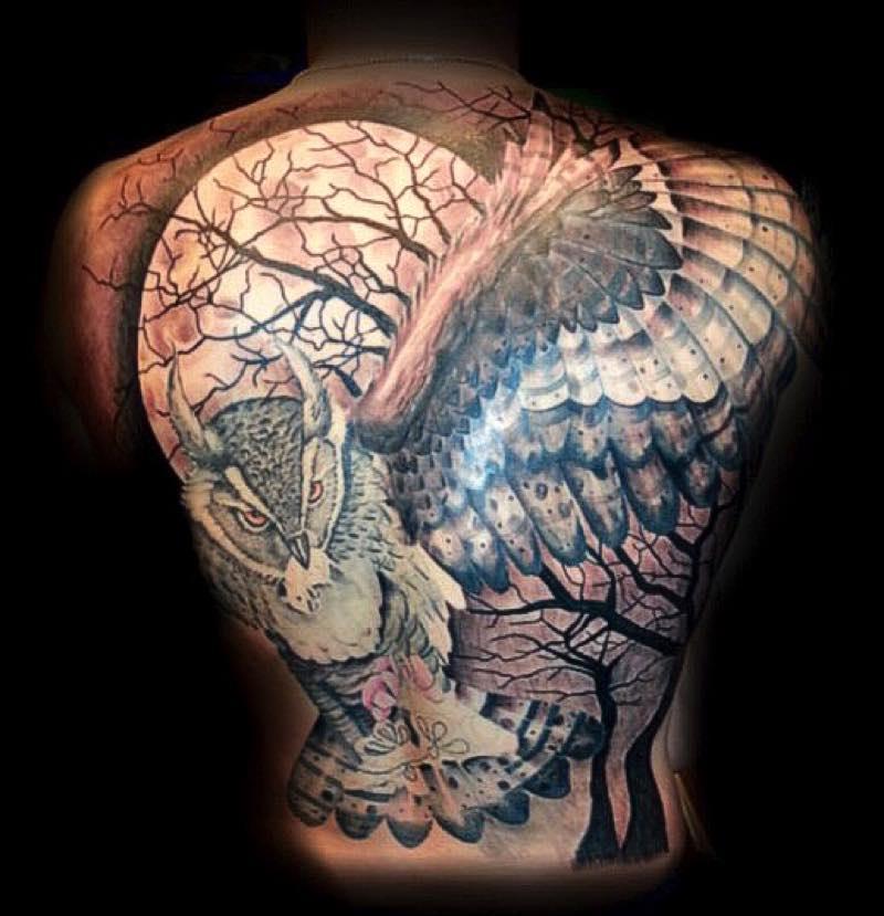 When my wife was in elementary school, she had a school picture where her mom did her hair and she looked like a great horned owl. I always teased her because she had those horns on her head! For my back piece, I wanted something that would represent my wife and kids, so I started with a great horned owl that took over my back.