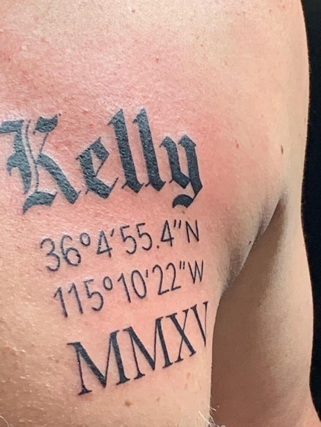 We were in front of Hard Rock and I saw the Hart & Huntington shop. I decided then and there that I wanted to get her name tattooed across my chest close to my heart, plus the coordinates of where we got married and the year in roman numerals.
