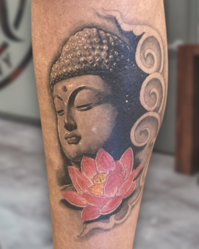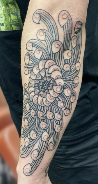 Traditional Japanese tattoos can be recognized by Gakubori, a background of waves or clouds. The scene or element is then placed over the Gakubori. Flowers are another common element in tattoos and hold a distinct meaning in Irezumi, but the underlying theme represents life, death, and rebirth.
