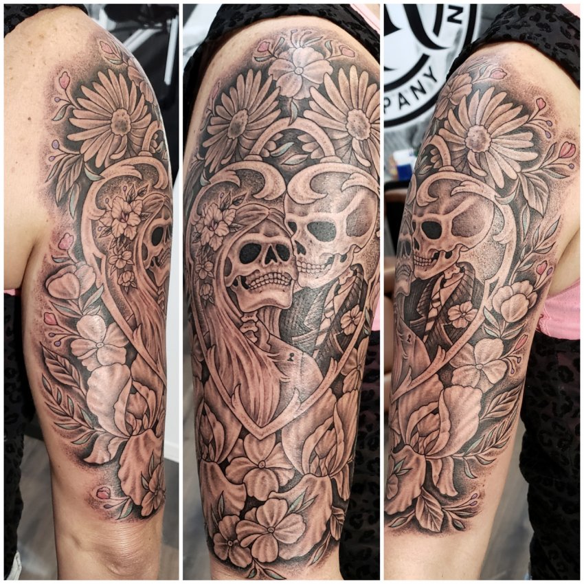 Using dark colors with gradient shading for the skull and deep contrasting red for the roses is a popular design style for skull tattoos with roses throughout. But don’t discount Watercolor, Neotraditional, Realism, and Sugar Skulls which represent the day of the dead in Mexican culture.
