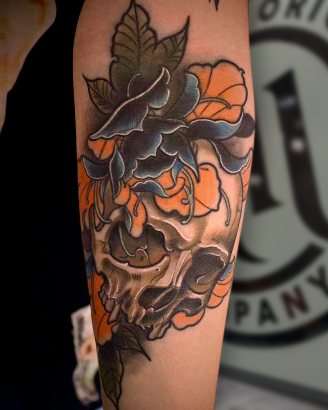 Neotraditional, CoverUp, Skull, Flower tattoo